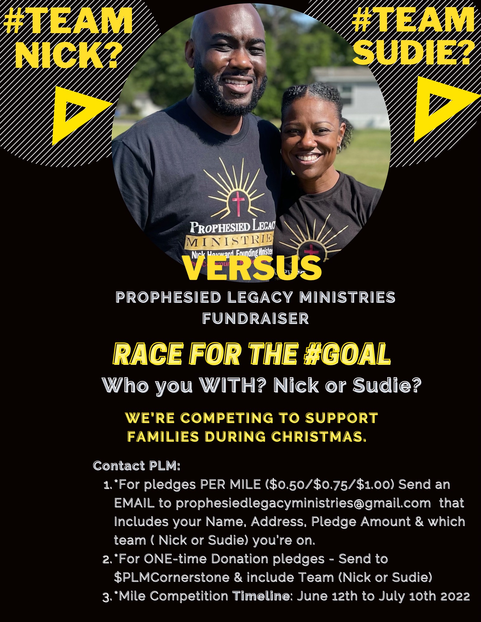 Prophesied Legacy Ministries has kicked off our second annual Race For The Goal (RFTG)! Last year Pastor Elect and Lady Heyward were able to run over 200 miles. Thanks to support and generous donations food and gifts were provided for four families. We look forward to another successful #RFTG!
